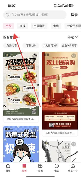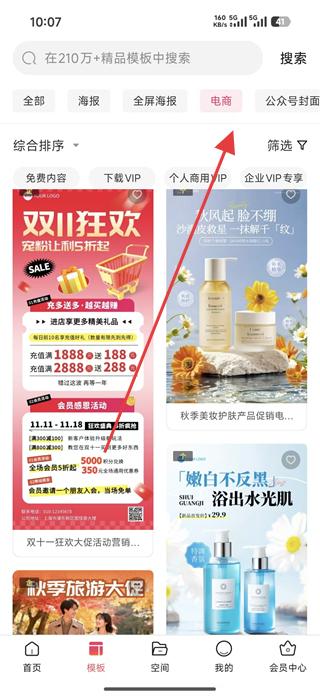 1、進入模板頁面,可看到全部、海報、全屏海報等分類,點擊電商分類,查看電商類模板,如雙十一狂歡海報。