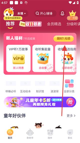 3、在首頁,參與新人福利活動,選分類聽故事、學知識,看童年好伙伴推薦,豐富兒童視聽體驗。