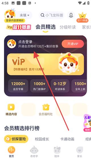 3、進入會員精選板塊點擊登錄按鈕,可開通會員暢聽120萬集好故事,享受會員專屬內(nèi)容、熱門IP等福利。