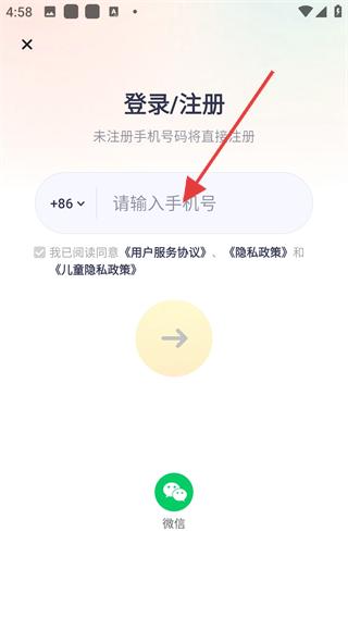 4、在登錄注冊頁面可輸入手機號或選擇微信登錄,完成登錄或注冊操作,以便享受會員服務和更多軟件功能,獲取優(yōu)質(zhì)的兒童音頻內(nèi)容。