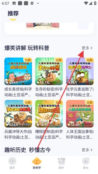 2、在推薦板塊可瀏覽爆笑講解玩轉(zhuǎn)科普等分類內(nèi)容,點擊更多按鈕,查看該分類下的全部音頻作品,選擇感興趣的內(nèi)容收聽。