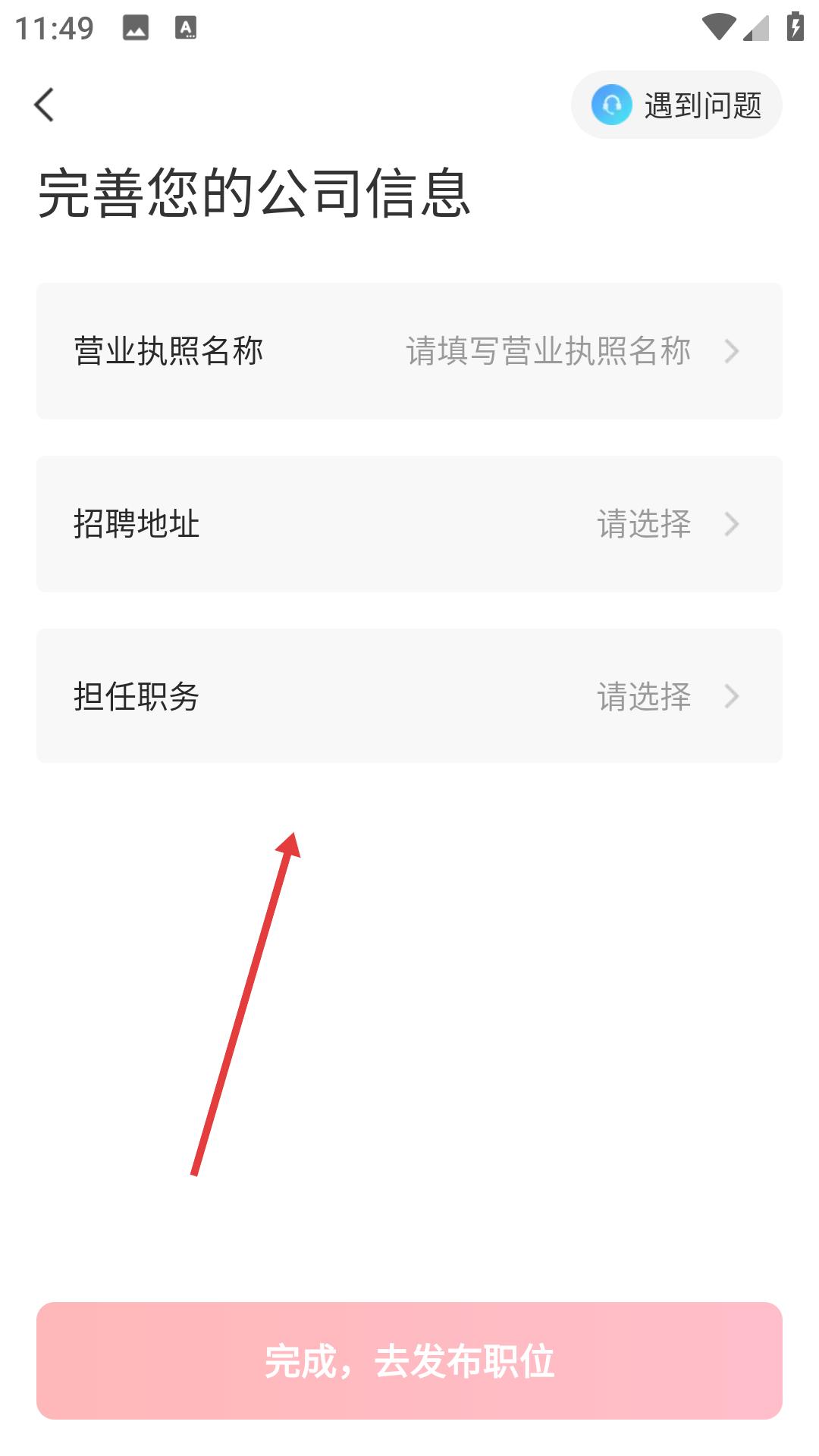 2、在完善公司信息頁面,需依次填寫營業(yè)執(zhí)照名稱、選定招聘地址,并明確擔(dān)任職務(wù),完成這些操作后,即可發(fā)布招聘職位。