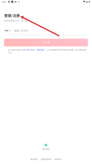 1、進(jìn)入登錄注冊界面,輸入手機(jī)號(hào),點(diǎn)擊下一步,進(jìn)行登錄或注冊操作,也可選擇微信登錄。