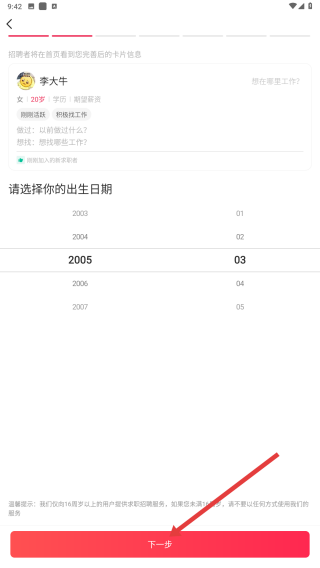 4、選擇出生日期,確認(rèn)后點(diǎn)擊下一步,繼續(xù)推進(jìn)求職信息完善流程。