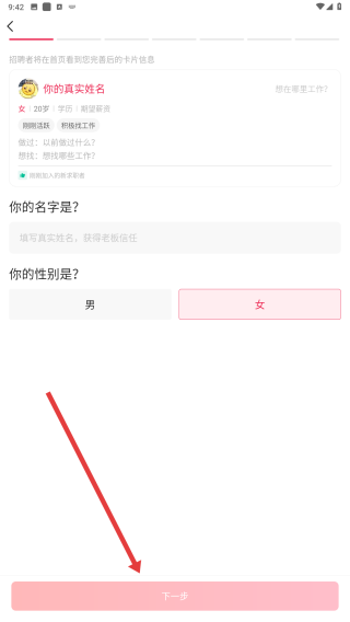 3、求職信息填寫頁面,填寫真實(shí)姓名、選擇性別等信息,填寫完成后點(diǎn)擊下一步。