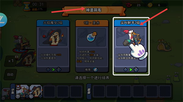 3、獲得神圣羽毛后,可選擇火焰魔女、尖叫射手等進行培養(yǎng),提升英雄等級和能力,增強戰(zhàn)斗力。
