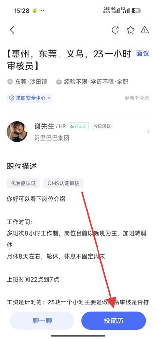 4、在職位描述頁面,確認(rèn)崗位信息無誤后,點(diǎn)擊投簡歷按鈕,完成該崗位的簡歷投遞操作。
