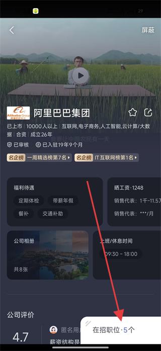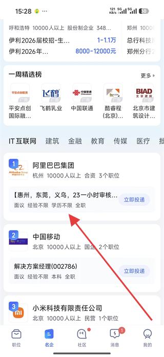 1、進(jìn)入名企板塊,找到阿里巴巴集團(tuán)的招聘信息,點(diǎn)擊該信息,進(jìn)入公司詳情頁面。