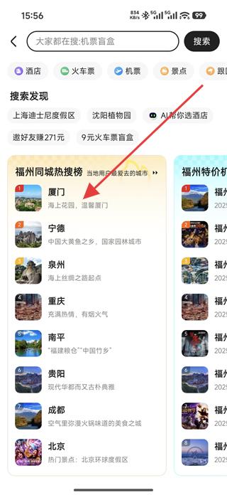 1、進(jìn)入軟件搜索發(fā)現(xiàn)頁(yè)面,瀏覽上海迪士尼度假區(qū)、沈陽(yáng)植物園等搜索發(fā)現(xiàn)內(nèi)容,選擇福州同城熱搜榜中的廈門,進(jìn)入廈門旅游信息頁(yè)面。