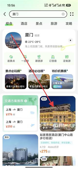 2、在廈門旅游信息頁(yè)面,查看綜合、酒店、景點(diǎn)等分類信息,選擇如家商旅酒店廈門中山路步行街店,進(jìn)入該酒店詳情頁(yè)面。