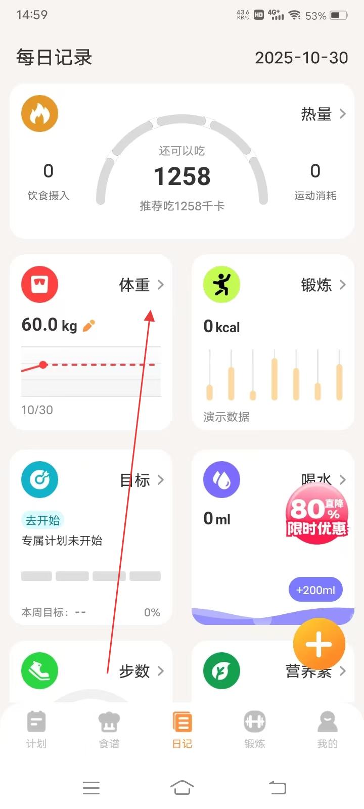 1、進入軟件日記頁面,查看每日記錄的飲食攝入、體重、運動消耗等數(shù)據(jù),點擊體重進入詳情頁。