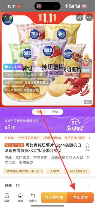 3、選擇心儀的商品,比如可比克純切薯片,點(diǎn)擊進(jìn)入商品詳情頁面,查看商品的價(jià)格、規(guī)格等信息,然后點(diǎn)擊立即購買。