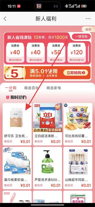 2、在新人福利頁面,可看到新人省錢津貼等內(nèi)容,點(diǎn)擊一鍵領(lǐng)取,獲取相關(guān)消費(fèi)券,還可瀏覽限時(shí)搶購的低價(jià)商品。