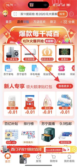 1、打開蘇寧易購app,進(jìn)入首頁在頁面中找到新人專享領(lǐng)大額津貼紅包板塊,點(diǎn)擊查看更多,進(jìn)入新人福利頁面。
