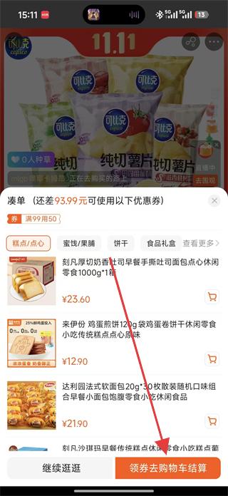 4、點(diǎn)擊立即購買后,若有可使用的優(yōu)惠券,會(huì)彈出湊單提示,可選擇繼續(xù)逛逛湊單或點(diǎn)擊領(lǐng)券去購物車結(jié)算完成下單。