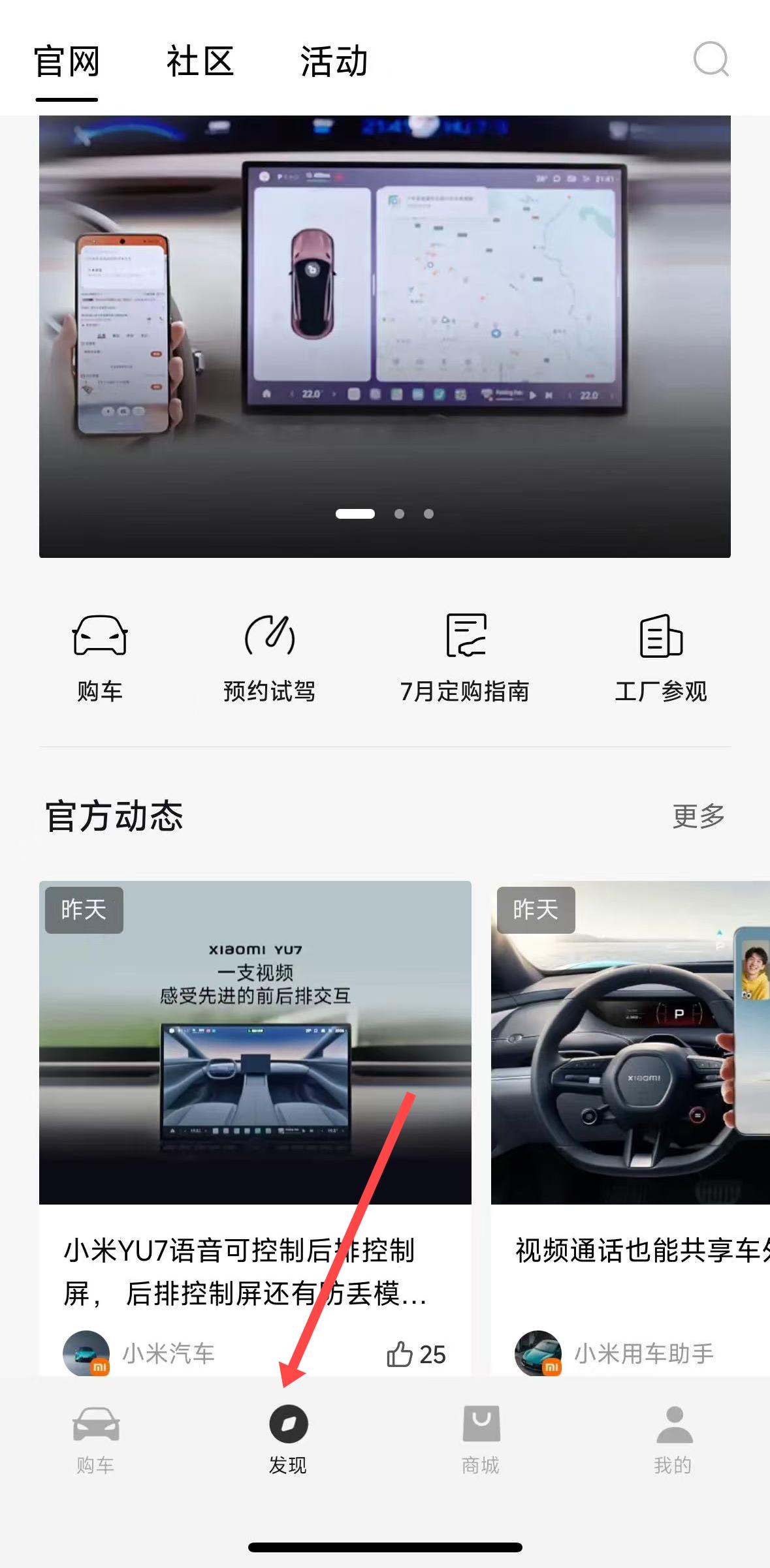 3、發(fā)現(xiàn)界面,有官網(wǎng)、社區(qū)、活動(dòng)等功能分類,展示了購車、預(yù)約試駕等服務(wù)入口和官方動(dòng)態(tài)內(nèi)容,方便用戶了解和使用小米汽車的相關(guān)服務(wù)。