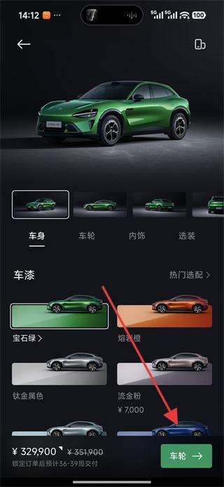 2、在車型選配界面選擇車身車漆,如寶石綠、熔巖橙等,然后點(diǎn)擊車輪,進(jìn)入車輪選配頁面。