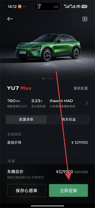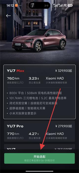 1、進(jìn)入汽車車型頁面,查看YU7Max、YU7Pro等車型的續(xù)航、加速、輔助駕駛等信息后,點(diǎn)擊開始選配。