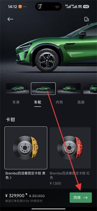 3、在車輪選配頁面選擇卡鉗顏色,如Brembo四活塞固定卡鉗紅色等,然后點(diǎn)擊內(nèi)飾,進(jìn)入內(nèi)飾選配頁面。