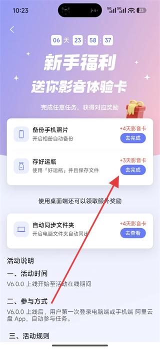 3、在新手福利送你影音體驗(yàn)卡頁面,找到存好運(yùn)瓶任務(wù),點(diǎn)擊去完成,參與該任務(wù)。
