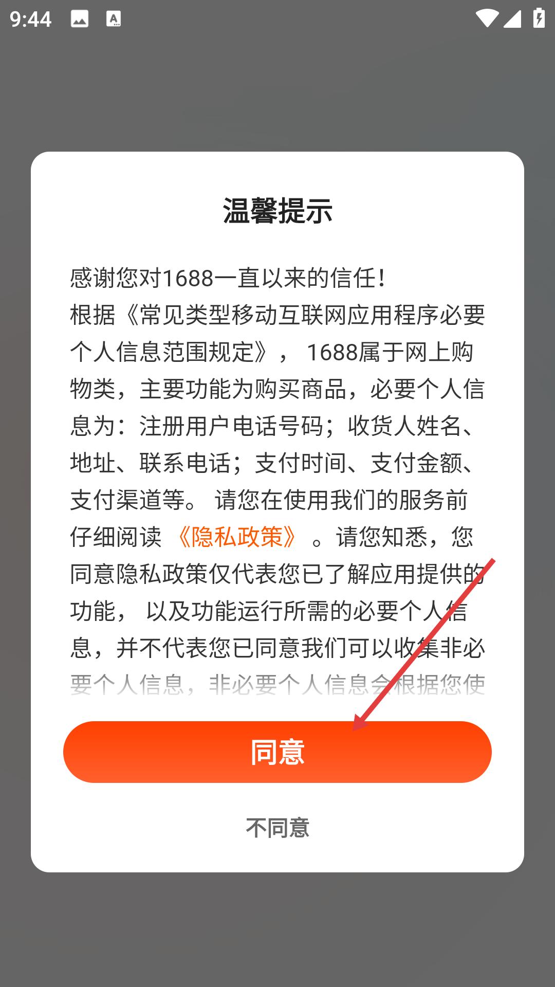 1、下載安裝完成后進(jìn)入,需在用戶協(xié)議和隱私政策界面點(diǎn)擊同意,接受相關(guān)條款后才能進(jìn)入應(yīng)用。