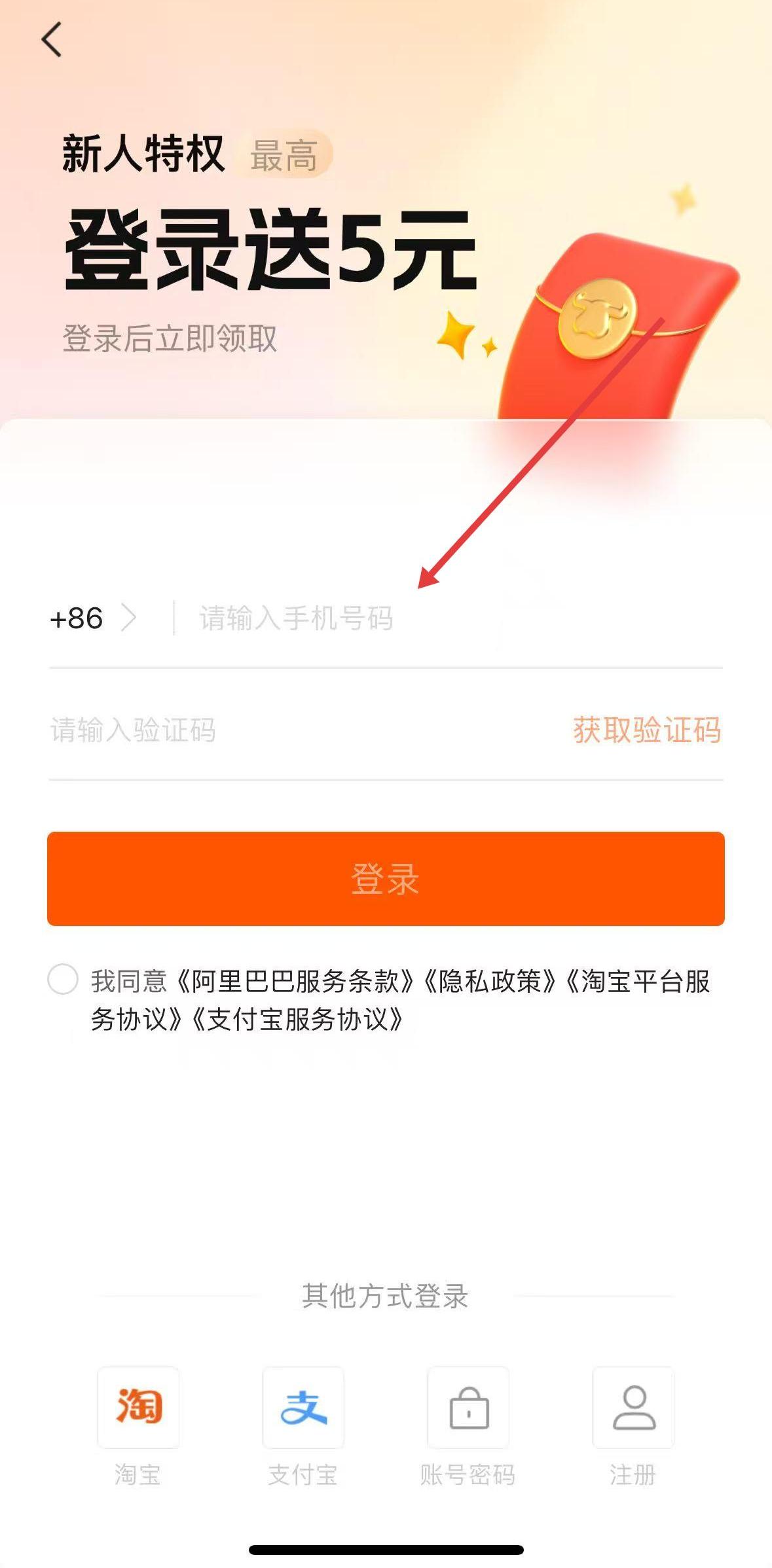 2、進(jìn)入登錄頁需填手機(jī)號(hào)、驗(yàn)證碼,勾選協(xié)議后登錄,也可選淘寶、支付寶等其他方式。