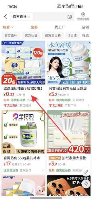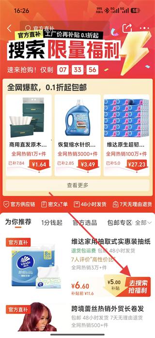 2、在官方直補(bǔ)板塊可看到維達(dá)家用抽取式實(shí)惠裝抽紙等商品,點(diǎn)擊去搜索搶福利按鈕,進(jìn)入商品搜索結(jié)果頁。
