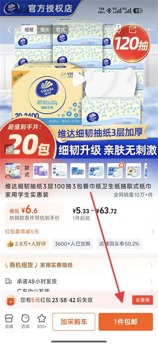 4、若有紅包可點(diǎn)擊去使用按鈕,使用紅包后點(diǎn)擊1件包郵按鈕,完成支付即可購買維達(dá)抽紙,享受官方直補(bǔ)優(yōu)惠。