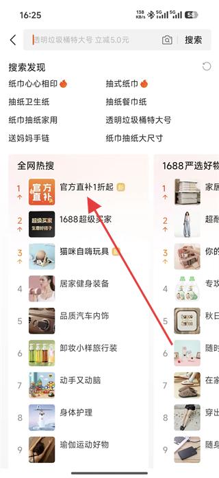 1、在搜索發(fā)現(xiàn)頁找到官方直補(bǔ)1折起的全網(wǎng)熱搜詞條,點(diǎn)擊進(jìn)入官方直補(bǔ)板塊。