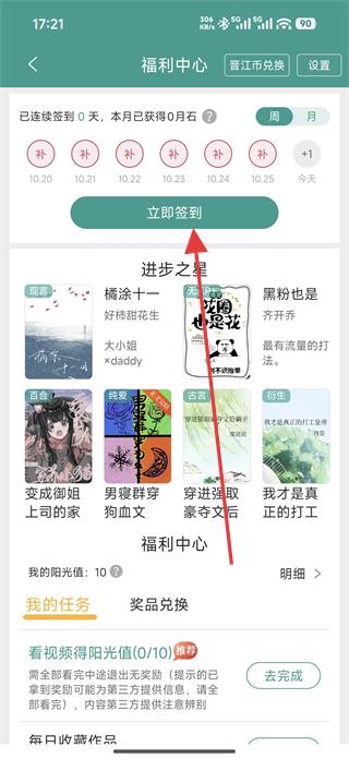 2、在福利中心頁面點擊立即簽到,參與每日簽到活動,還可查看進步之星推薦的作品及我的任務(wù)等內(nèi)容。