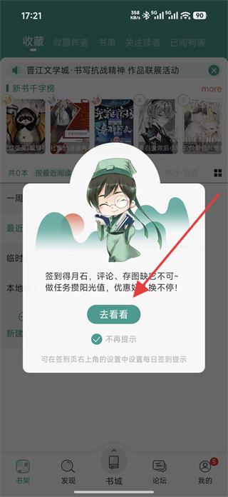 1、打開晉江小說app彈出的簽到提示框中,點擊去看看進入福利中心頁面。
