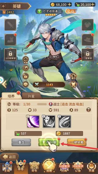 3、進(jìn)入英雄界面,可對英雄進(jìn)行培養(yǎng),點(diǎn)擊升級按鈕提升英雄等級,還能進(jìn)行升星等操作,增強(qiáng)英雄戰(zhàn)力。