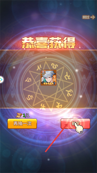 2、召喚獲得英雄后,會(huì)顯示恭喜獲得界面,可選擇再抽一次或確定,領(lǐng)取獲得的英雄,繼續(xù)游戲進(jìn)程。