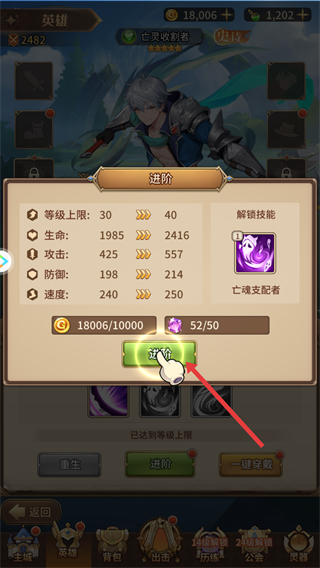 4、英雄等級達(dá)到上限后可進(jìn)行進(jìn)階,進(jìn)階后生命、攻擊等屬性提升,還能解鎖新技能,進(jìn)一步強(qiáng)化英雄。