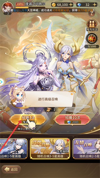 1、可進(jìn)行高級召喚,有招募1次和招募10次選項(xiàng),還可免費(fèi)招募,隨機(jī)獲得3-5星英雄,擴(kuò)充英雄陣容。