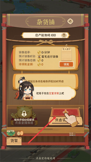 4、在雜貨鋪界面可點(diǎn)擊貨架添加商品,查看銷售速率、預(yù)計(jì)銷售額等數(shù)據(jù),領(lǐng)取將領(lǐng)金額,經(jīng)營店鋪。