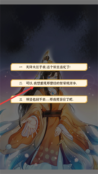 1、可選擇劇情選項(xiàng),如想重現(xiàn)紫菀桃源鄉(xiāng)等,選擇后開啟游戲劇情,進(jìn)入經(jīng)營玩法。