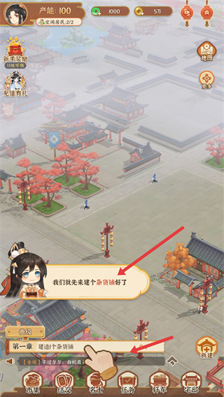 2、在主城界面可建造雜貨鋪,點(diǎn)擊建造按鈕選擇雜貨鋪,開始建設(shè)建筑,發(fā)展城市產(chǎn)業(yè)。