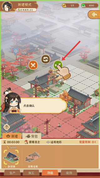3、建造雜貨鋪時(shí)點(diǎn)擊確認(rèn)按鈕,完成建筑建造,在城市布局建筑,提升城市產(chǎn)能。