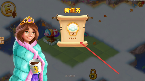 2、會出現(xiàn)新任務界面,可領取如驅(qū)散迷霧等任務,完成新任務能推進游戲進程,解鎖新內(nèi)容。