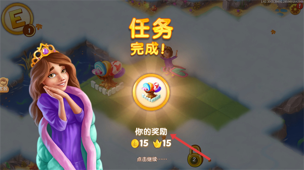 1、完成任務后會顯示任務完成界面,可獲得金幣、皇冠等獎勵,點擊繼續(xù)可進入下一個游戲環(huán)節(jié)。