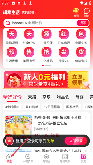 1、精選頁可搜iphone16比價,有購物返利、外賣紅包等功能,新人享0元4重禮,還推盼盼梅尼耶干蛋糕等精選好價商品。