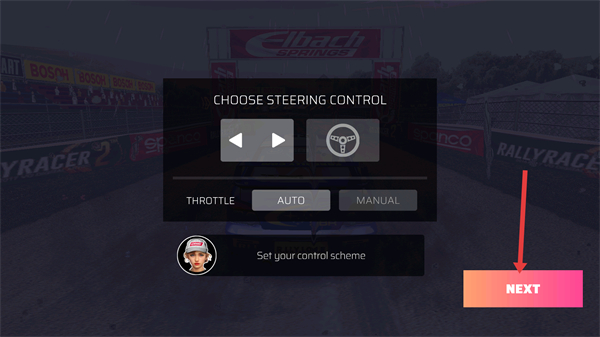 1、先選擇轉(zhuǎn)向控制和油門(mén)模式,設(shè)置好操控方案后,點(diǎn)擊NEXT進(jìn)入比賽,開(kāi)啟拉力賽車(chē)之旅。