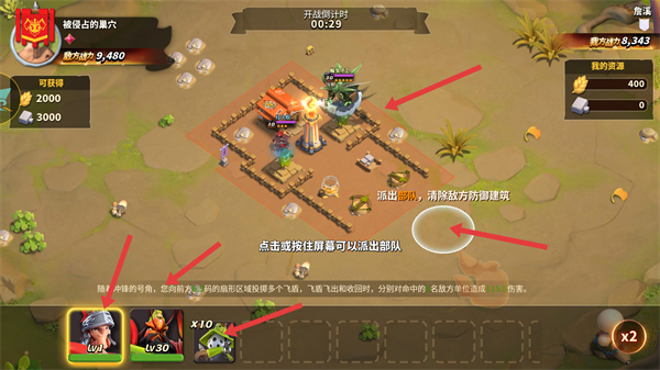 2、需派出部隊(duì),點(diǎn)擊或按住屏幕出兵,清除敵方防御建筑,逐步占領(lǐng)巢穴,獲取勝利。