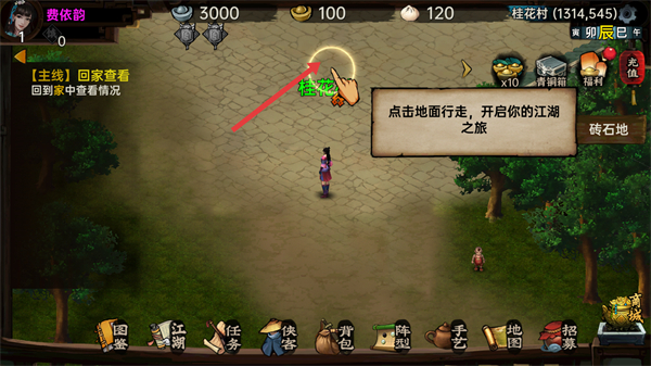 1、點擊畫面行走,在江湖場景移動,開啟江湖之旅,完成主線任務(wù)如回家查看,推進(jìn)游戲劇情。