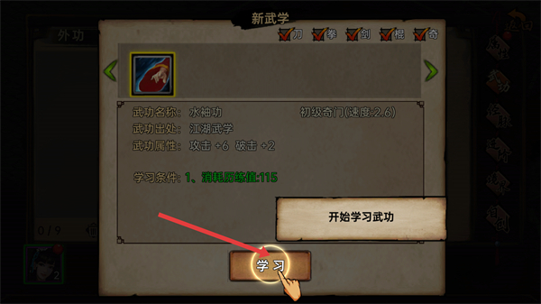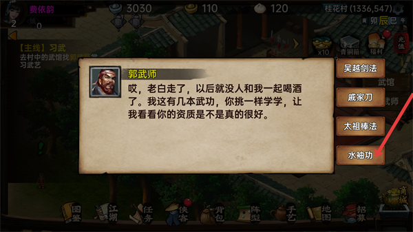 3、在武館找郭武師學(xué)習(xí)武功,可選擇吳越劍法、戚家刀等武功,根據(jù)自身資質(zhì)選擇合適武功學(xué)習(xí)。
