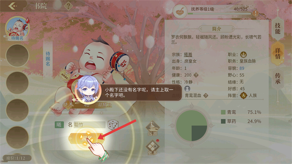 2、在書院為子女取名,輸入名字后確認(rèn),為子女賦予身份,推進(jìn)育兒養(yǎng)成進(jìn)程。