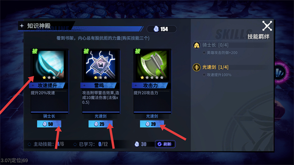 2、可在知識神殿學習技能,如攻速提升、光逢劍等,消耗資源學習技能,增強角色的戰(zhàn)斗能力。