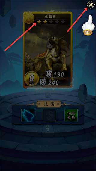 4、開寶箱可獲得如金睛獸等卡牌,卡牌有攻、防屬性和技能,查看卡牌詳情可了解其能力,用于后續(xù)戰(zhàn)斗。