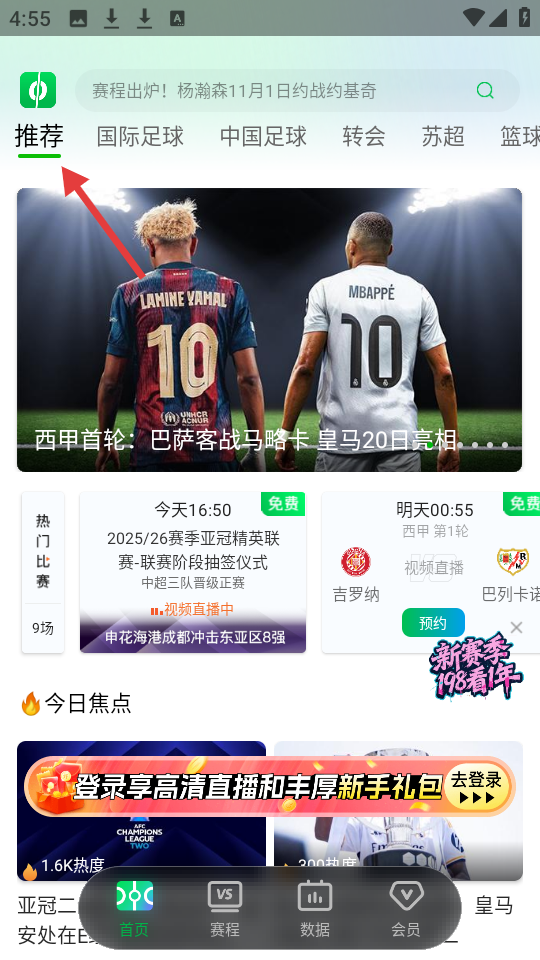 1、體育APP首頁推薦欄,展示足球賽事資訊,如西甲首輪對(duì)陣,還有熱門比賽預(yù)告,并有登錄享福利提示。